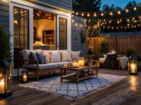 Cozy and Inviting Porch Adorned with Twinkling String Lights at Sunset A Warm and Welcoming Outdoor Living Space with a Festive Romantic Ambiance