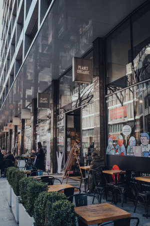 London, UK - March 06, 2020: Facade of Planet Organic food store in Tottenham Court Road, London, the UKs largest fully certified organic supermarket.