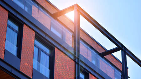 Architectural exterior detail of residential apartment building with brick facade. Modern brick and glass facade of the apartment building.