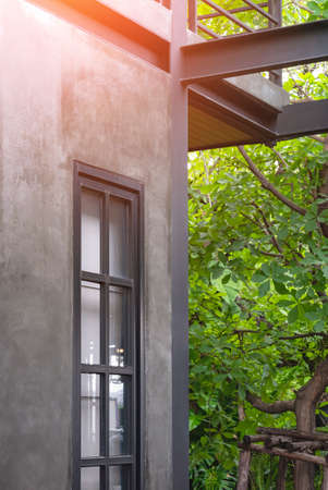 Side view of glass window on cement wall of vintage house in industrial loft style with green plant in vertical frame