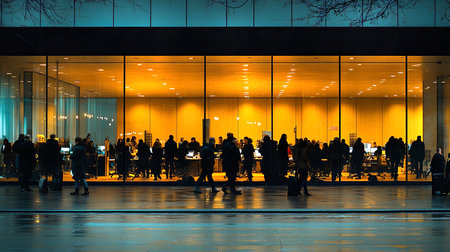 Business people out of the office building at night in blur motion.