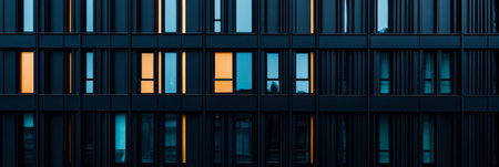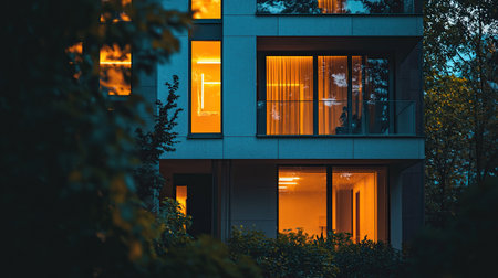 Close-up of a modern building's exterior with illuminated windows at dusk