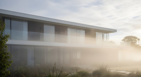 A luxurious modern two-story house with large glass windows is shrouded in a thick, mysterious morning fog. The soft light and mist create an atmospheric and moody scene, emphasizing the clean lines of the architecture.