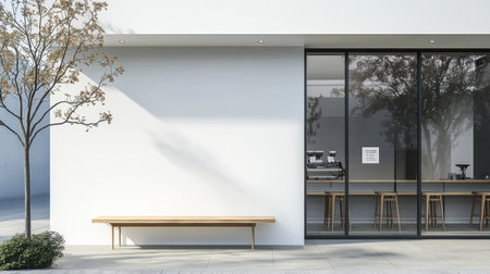 Minimalist coffee shop exterior, pure white wall, sharp-edged glass panels, and one modern chair softly illuminated by natural light at the door