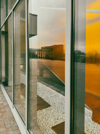 Close-up view of a modern glass building showcasing a unique facade with reflections of light and color. This image captures the essence of contemporary urban architecture.