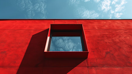 A red building with a window and blue sky in the background, AI