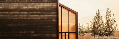 A contemporary building showcases a mix of dark wood and large glass windows against a warm sunset backdrop. Nearby trees stand tall adding a natural element to the setting.