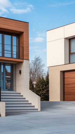AI Generated. Elegant architectural facade with wooden windows in urban setting