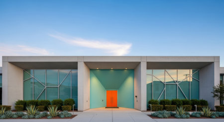 Contemporary architecture featuring a prominent entryway with vibrant doors and sleek glass facades, complemented by lush landscaping and a bright sky.