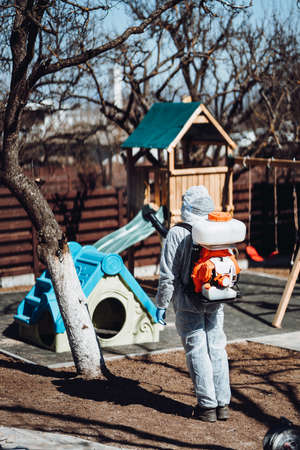 Cleaning and Disinfection on the playground in the sity complex amid the coronavirus epidemic Teams for disinfection efforts Infection prevention and control of epidemic Protective suit mask and spray bag