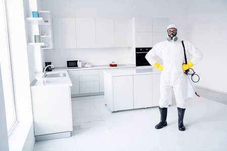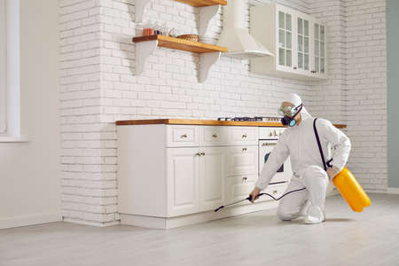 Exterminator fighting insects in house. Pest control home service guy in mask and white protective suit spraying poisonous gas or liquid from sprayer bottle on floors and cupboards in kitchen interior