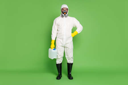 Full length body size view of his he disinfectant wearing gas mask holding in hand big bottle sanitizer sars ncov covid19 cov ebola influenza prevention isolated over green pastel color background