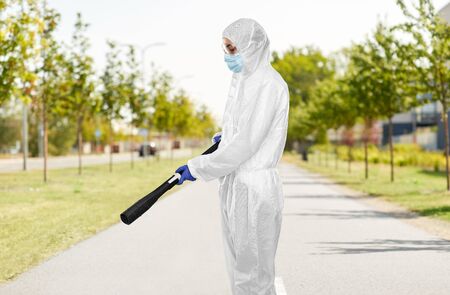 COVID-19 and disinfection. Disinfection specialist, a medical worker in a protective suit processes surfaces on the street using special equipment.