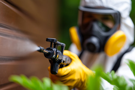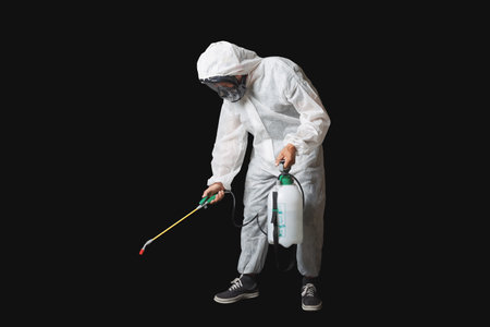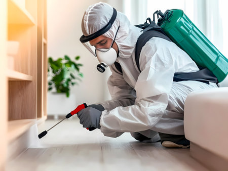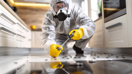 Exterminator in protective gear targeting cockroaches on floor. Precision pest control in action. Concept of thorough sanitation, professional extermination, and pest management.