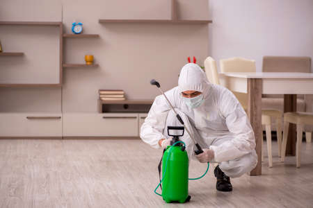 Young male contractor doing pest control at home