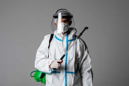 Male worker wearing protective suit while using disinfectant spray to prevent coronavirus transmission in the studio with brown background