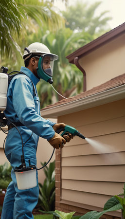 Pest control technician spraying insecticide on residential exterior for termite prevention.