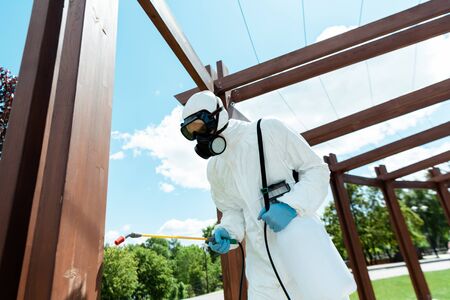 specialist in hazmat suit and respirator disinfecting wooden construction in park during coronavirus pandemic