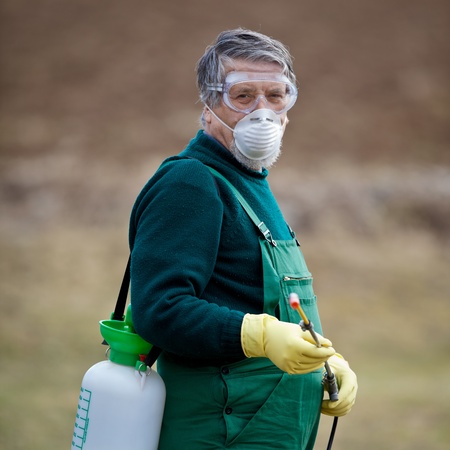 A farmer outdoors in orchard at sunset, using pesticide chemicals.