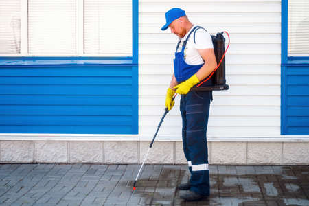 Man in work jumpsuit treats sidewalk from weeds. Disinfection of adjacent territory of house. Spraying weeds in city. Real workflow scene