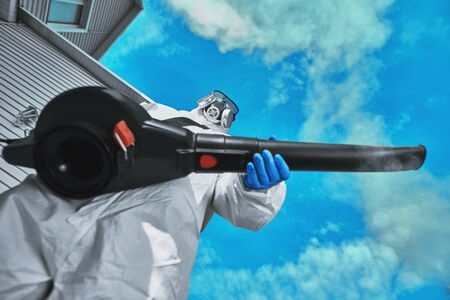 A guy from the pest control service in a mask and a white protective suit sprays poisonous gas.