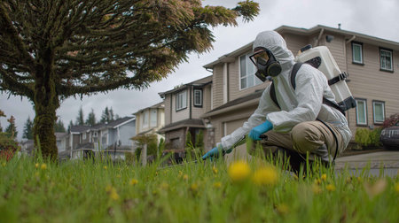 A dedicated pest control worker applies treatment to a residential lawn, ensuring effective weed management while following health and safety precautions in a suburban environment.