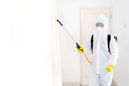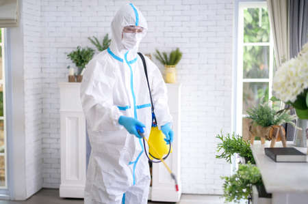 Disinfectant service worker wearing protective suit while cleaning interior house with disinfectant spray during coronavirus pandemic