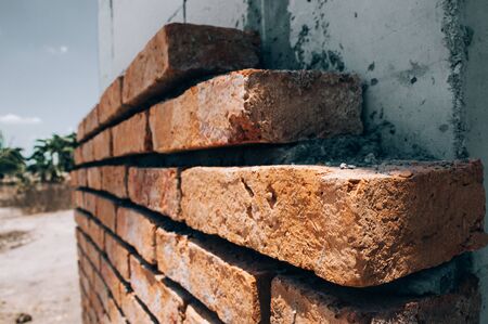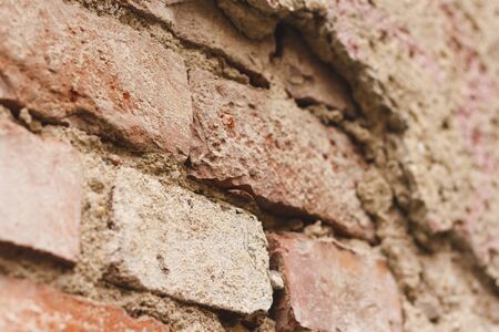 Side angle of a red brick wall corner. Close up view of cracked weathered brickwork material. Modern interior design, unique perspective. Loft like room style at home. Rusty facade architecture.
