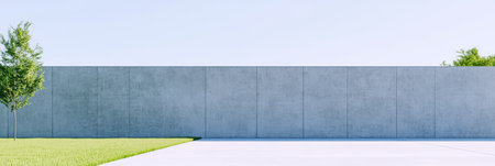 A massively high concrete security boundary wall topped with barbed wire on a blue sky background - 3D render