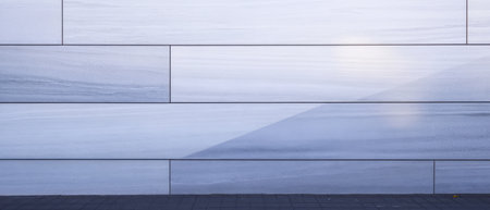 The setting showcases a contemporary wall with smooth gray and blue panels reflecting light softly. This architecture emphasizes simplicity and elegance in urban design.