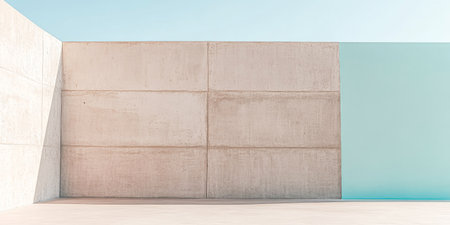A minimalist architectural space showcases smooth concrete walls contrasting with a vibrant turquoise section under clear blue sky. The serene atmosphere highlights modern design principles.