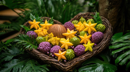 A stunning heart-shaped display of vibrant exotic fruits, including starfruit and purple varieties, showcases a beautiful natural arrangement among lush greenery.