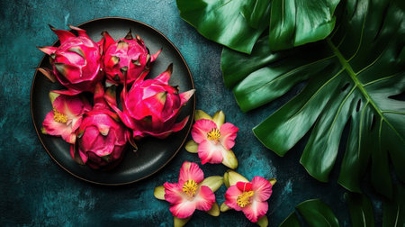 A stunning flat lay featuring vibrant dragon fruits alongside delicate pink tropical flowers on a dark textured surface, showcasing natural beauty and freshness.