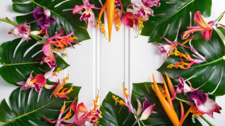 A vibrant arrangement of tropical flowers including orchids and heliconia, framed by monstera leaves on a white background.
