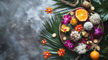 A vibrant display of tropical fruits and colorful flowers set against a textured background enhancing the festive spirit of Christmas.