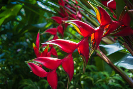A closeup selective focus shot of Heliconia flowering plant in the middle of the garden