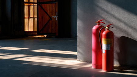 A pair of red fire extinguishers stands in the corner of an industrial space, illuminated by sunlight streaming through windows, emphasizing safety and preparedness.