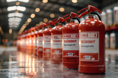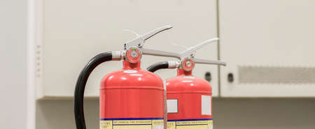 Fire extinguishers in a row in a modern factory. Industrial background