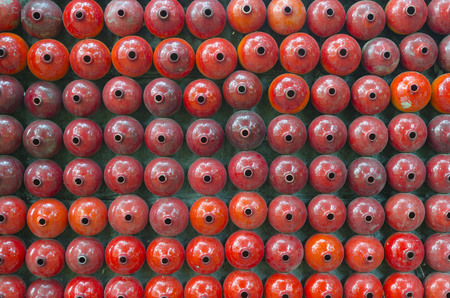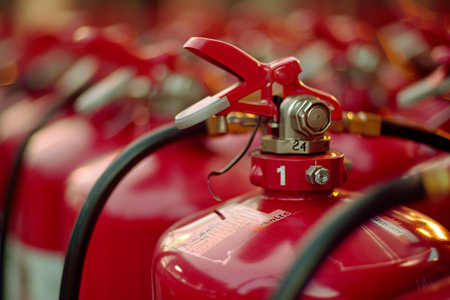 Fire extinguisher in a row, shallow depth of field, selective focus