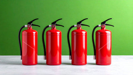 A neat row of four bright red fire extinguishers stands ready against a vibrant green wall, symbolizing a commitment to safety and emergency preparedness.