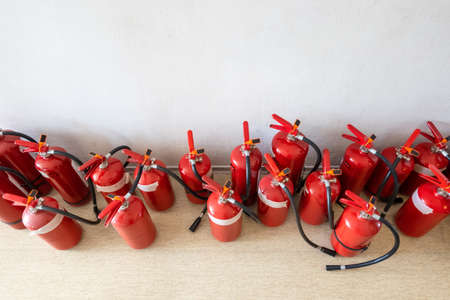 Bunch of expired fire extinguishers on the floor next to the wall. Renewal of extinguishers for businesses.