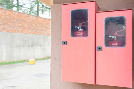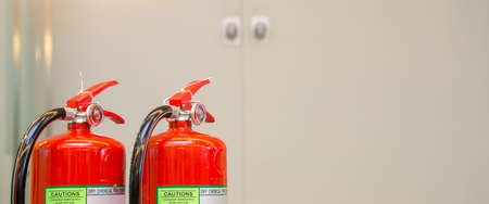 Close-up the red fire extinguishers tank at the door exit way in the building concepts of prevent case for emergency and safety rescue and fire training.