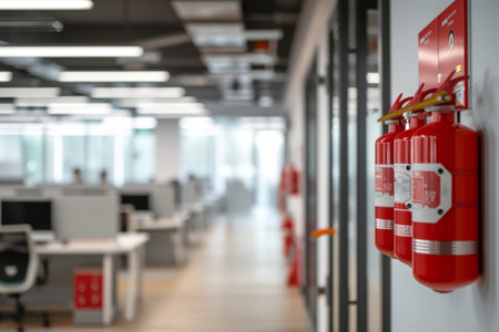 Red fire extinguisher positioned in office corridor to promote safety awareness for employees and visitors at work.