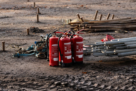 Several fire extinguishers are positioned on a construction site, surrounded by equipment and materials. The area shows signs of ongoing work with tools scattered around.