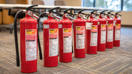 A row of vibrant red fire extinguishers positioned strategically on a table in a modern office setting. The visible labels highlight safety instructions for effective fire response, emphasizing the importance of emergency preparedness and fire prevention in workplace environments.