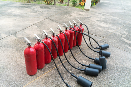 A row of red fire extinguishers placed on a concrete surface, highlighting essential safety equipment for preventing and responding to fire hazards in outdoor settings.