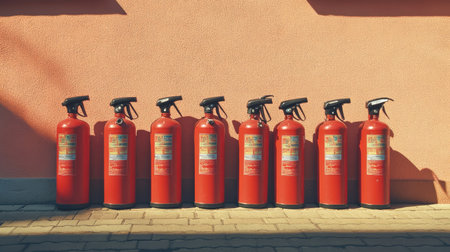 Fire extinguishers standing in line by the wall of a building
