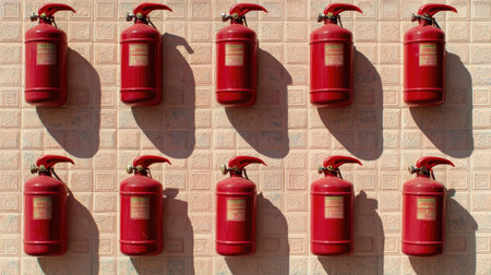 A row of red fire extinguishers mounted on a wall, symbolizing safety preparedness and emergency response readiness in public or industrial spaces.