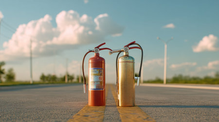 Two fire extinguishers, one red and one gold, stand prominently on an empty road, symbolizing safety and emergency preparedness against fire risks.