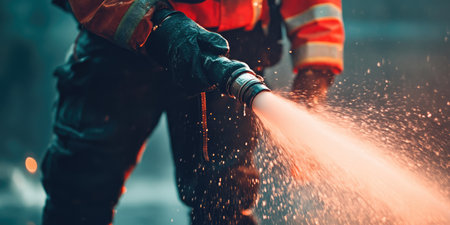 A dedicated firefighter confronts a fierce blaze, wielding a powerful hose as billowing smoke envelops the room. Generative AI